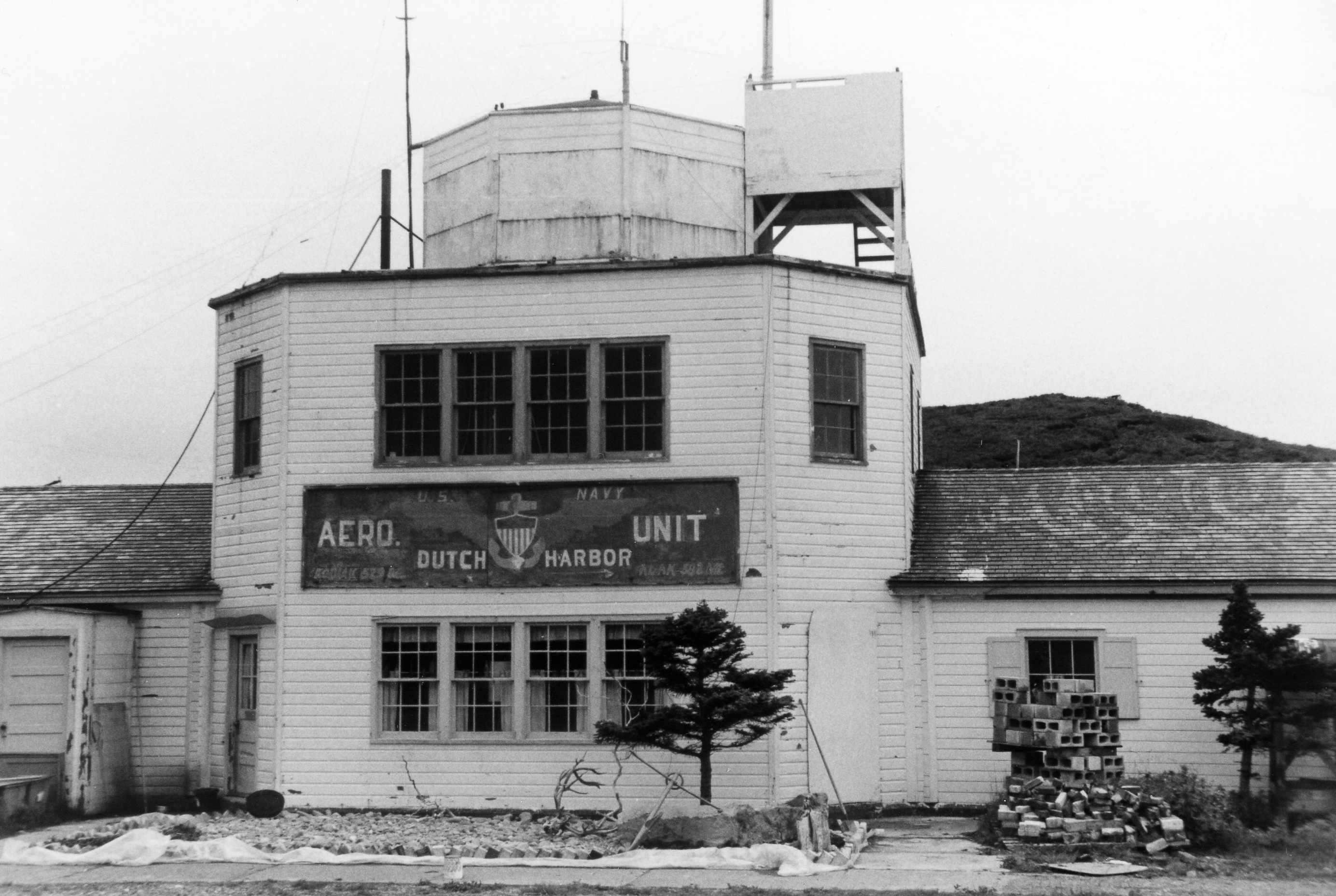 Description: United States of America, Alaska, Dutch Harbor. The building at the airport used as a communication room and terminal, with the old United States Navy Aero Unit insignia in August 1972 before the restoration years later.