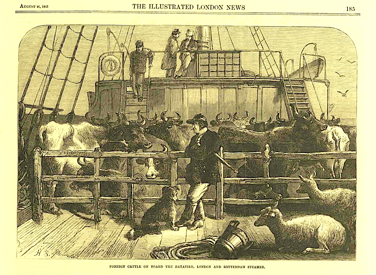 Description: The Batavier [sic], a Dutch steamship that carried cattle and sheep from the European mainland to London. One of 30 vessels in the trade, she was primarily a passenger ship that brought a few beasts on her decks besides a general cargo. The promiscuous mixing of animals from all over mainland Europe at the Metropolitan Cattle Market, London, was bound to introduce cattle disease. The cattle plague of 1865 (the same year as this engraving) has been described as the most dramatic event in 19th century British agricultural history.