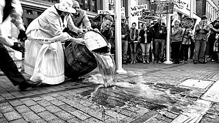 Description: Frazier president Penny Peavler and director of marketing Andy Treinen dump a barrel of bourbon to mark the opening of "Spirits of the Bluegrass: Prohibition and Kentucky."