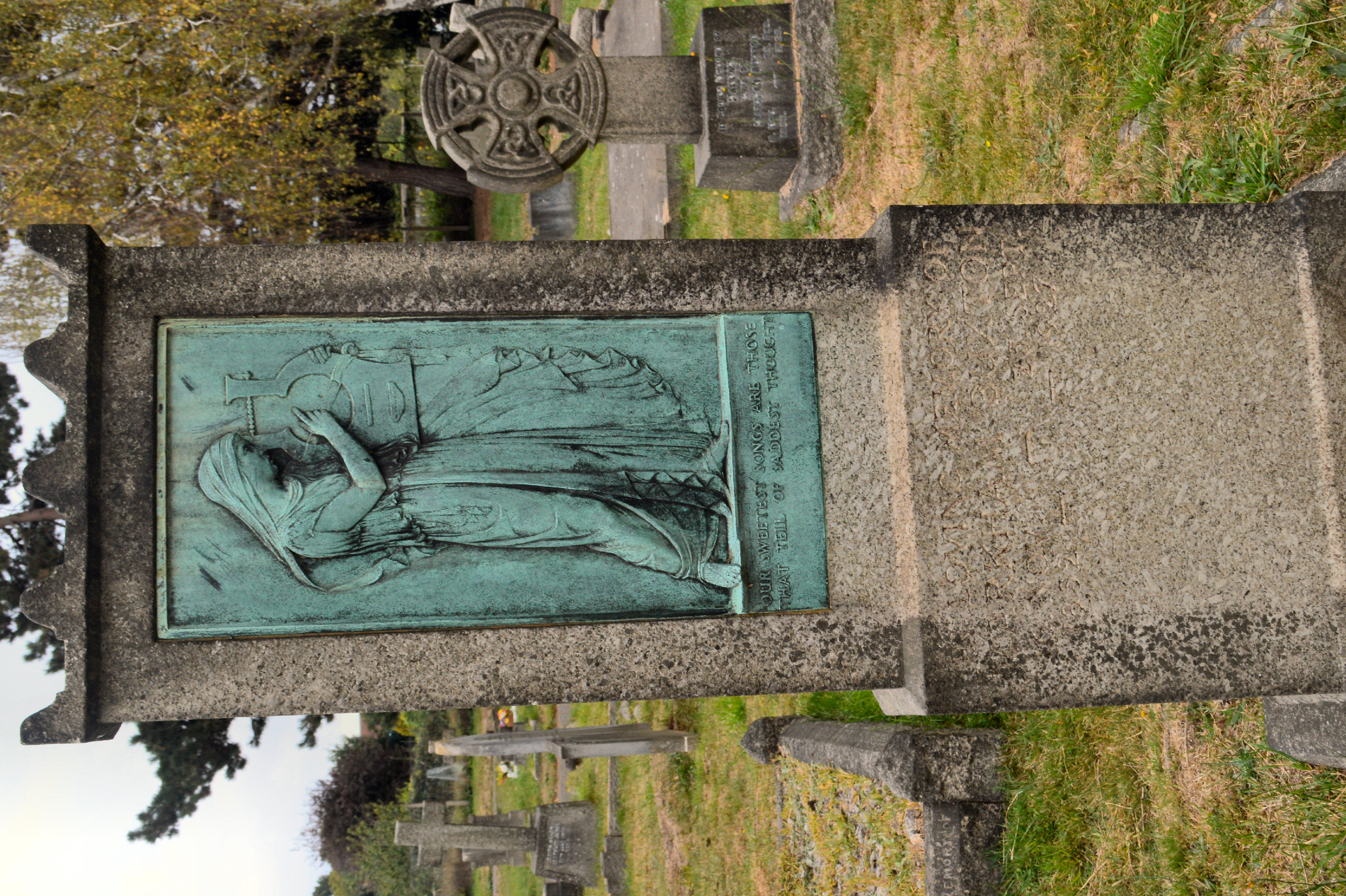 Description: East Sheen Cemetery, Markham Buxton (1852-1927) memorial by Alfred Buxton (b1884). The inscription reads "OUR SWEETEST SONGS ARE THOSE WHICH TELL OF SADDEST THOUGHTS". Alfred Buxton, a local sculptor, exhibited at the Royal Academy Between 1910 and 1929, including a relief "Chanson Triste" (1927) which is probably this work.