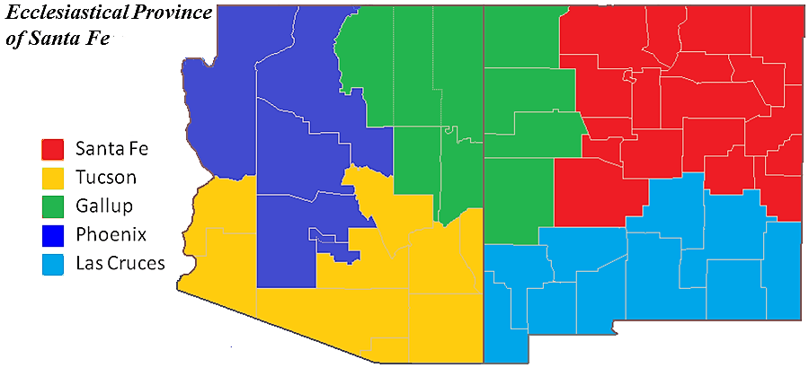 Description: The Ecclesiastical Province of Santa Fe encompasses the states of New Mexico and Arizona, USA. Dioceses (in order of establishment): 1850 - ⬛ Archdiocese of Santa Fe 1897 - ⬛ Diocese of Tucson 1939 - ⬛ Diocese of Gallup 1969 - ⬛ Diocese of Phoenix 1982 - ⬛ Diocese of Las Cruces
