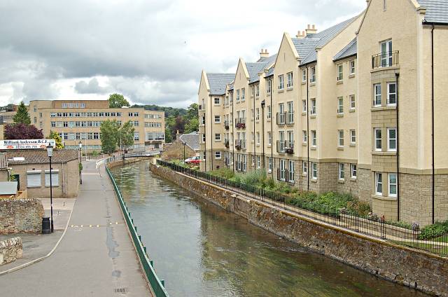 Description: Eden, Cupar. Looking down the Eden from South Bridge with the council buildings at the far end and Eden House at this end and some light industrial units on the left bank. All this area used to be industrial but land prices have made it more attractive to new commercial developments and the industries have moved to purpose built industrial estates on the edge of town.