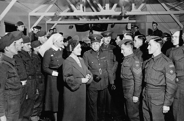 Description: H.M. Queen Elizabeth, accompanied by Matron Agnes C. Neill, talking with personnel of No.15 Canadian General Hospital, Royal Canadian Army Medical Corps (R.C.A.M.C.), Bramshott, England, 17 March 1941