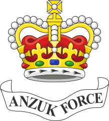Description: The emblem of ANZUK; a tripartite force formed by Australia, New Zealand and the United Kingdom from 1971 to 1974.