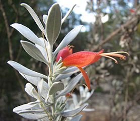 Description: Eremophila glabra 'Murchison Magic' (cultivated, labelled) Maranoa Gardens, Balwyn, Victoria, Australia