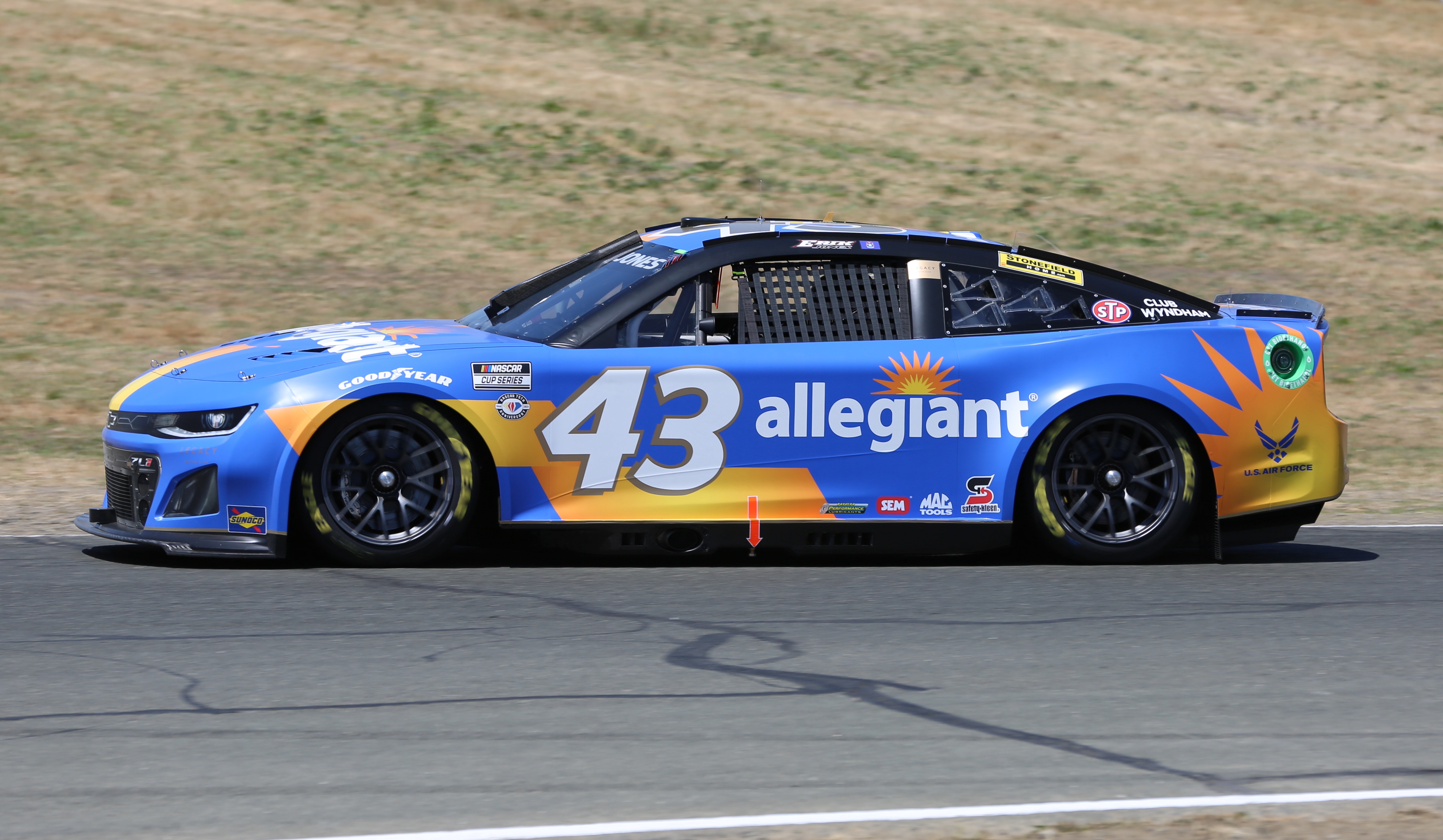 Description: Erik Jones' No. 43 Allegiant Chevrolet at Sonoma Raceway in 2023. Jones finished 32nd.