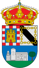 Description: Escudo de forma española, cortado y medio partido. Primero de Dávalos, sobre campo de azur un castillo de oro, donjonado, almenado, mamposteado de sable y aclarado en gules, con bordura componada de plata y gules. Segundo, de Estuñiga, que es de plata, banda de sable resaltada de una cadena de oro puesta en orla. Tercero, en azur, una ermita de plata con un roble al natural, terrazados en sinople. Al timbre, Corona Real de España.
