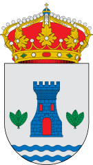 Description: Escudo de Mazarambroz, en Toledo (España). En campo de plata una torre de azur mazonada de sable y aclarada de gules. A los lados 2 ramos de 3 hojas de sinople bien ordenadas. En punta 2 ondas de azur. Todo ello timbrado de la corona real.