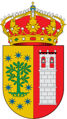 Description: Escudo de Robledo de Chavela (Madrid): Partido. Primero, en oro, un roble de su color, arrancado, acompañado de ocho estrellas, de azur. Segundo, en gules, una torre de iglesia, de plata. Va timbrado con la Corona Real cerrada. BOCM, de 29 de enero de 1992