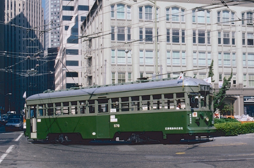 Description: During the 1987 San Francisco Historic Trolley Festival, ex-Kobe (Japan) streetcar 578 turns into the Transbay Terminal loop from First Street, in scheduled service on the F-Market line. Car 578 (often referred to as "578-J" or "578(J)" to distinguish it from another San Francisco streetcar numbered 578) was built in 1927 for the Kobe City Railway (as No. 574, later renumbered 578). After World War II (or not until after the closure of the Kobe streetcar system in 1971, according to one source), it was sold to the Hiroshima system and operated on that system for several more years, keeping its two-tone green Kobe paint scheme. It was brought to San Francisco in 1986, for operation in the annual Trolley Festival service.