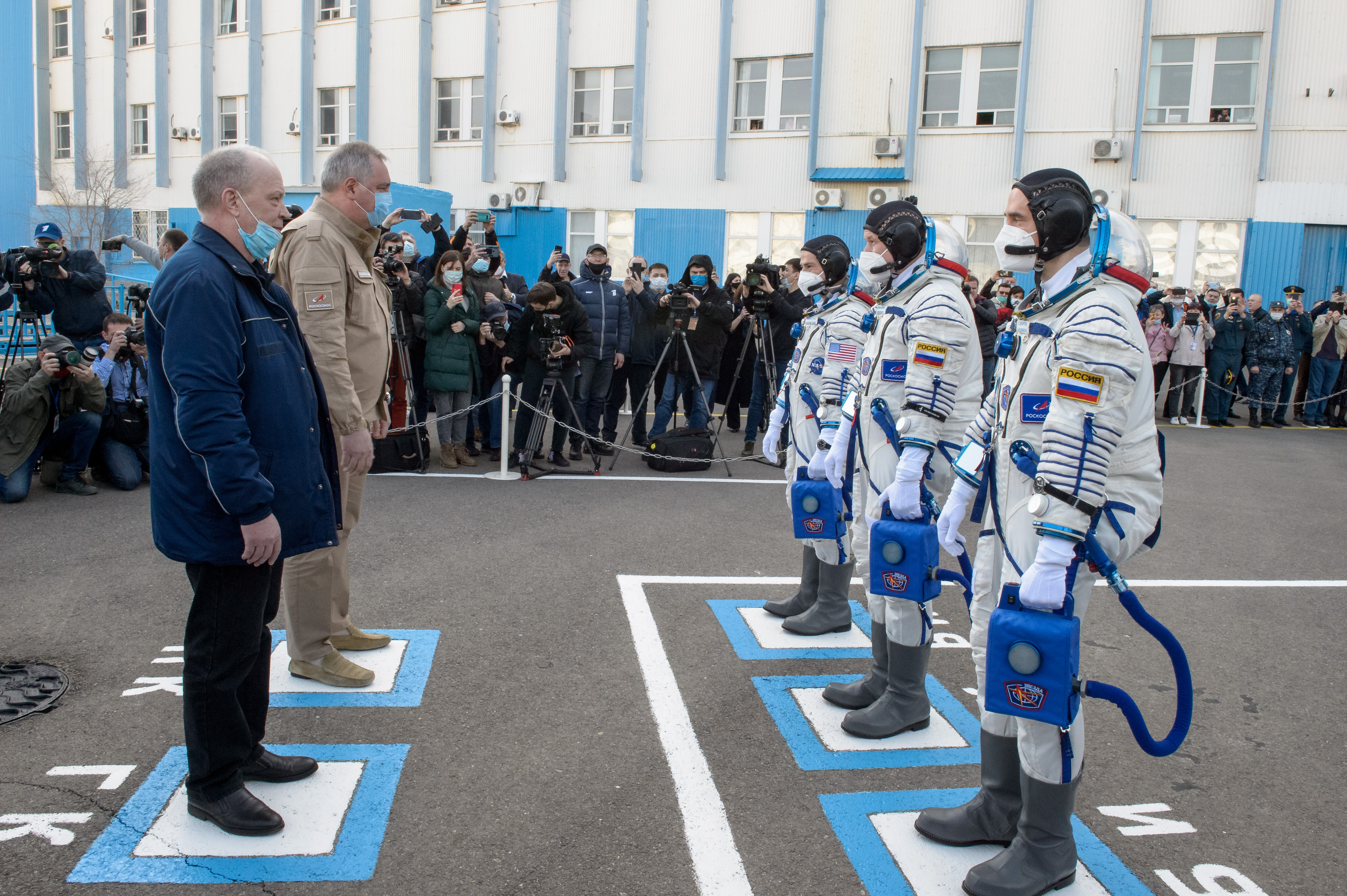 Description: Expedition 65 NASA astronaut Mark Vande Hei, left, Russian cosmonauts Oleg Novitskiy, center, and Pyotr Dubrov report to Roscosmos mission management prior to their Soyuz launch to the International Space Station Friday, April 9, 2021 in Baikonur, Kazakhstan.