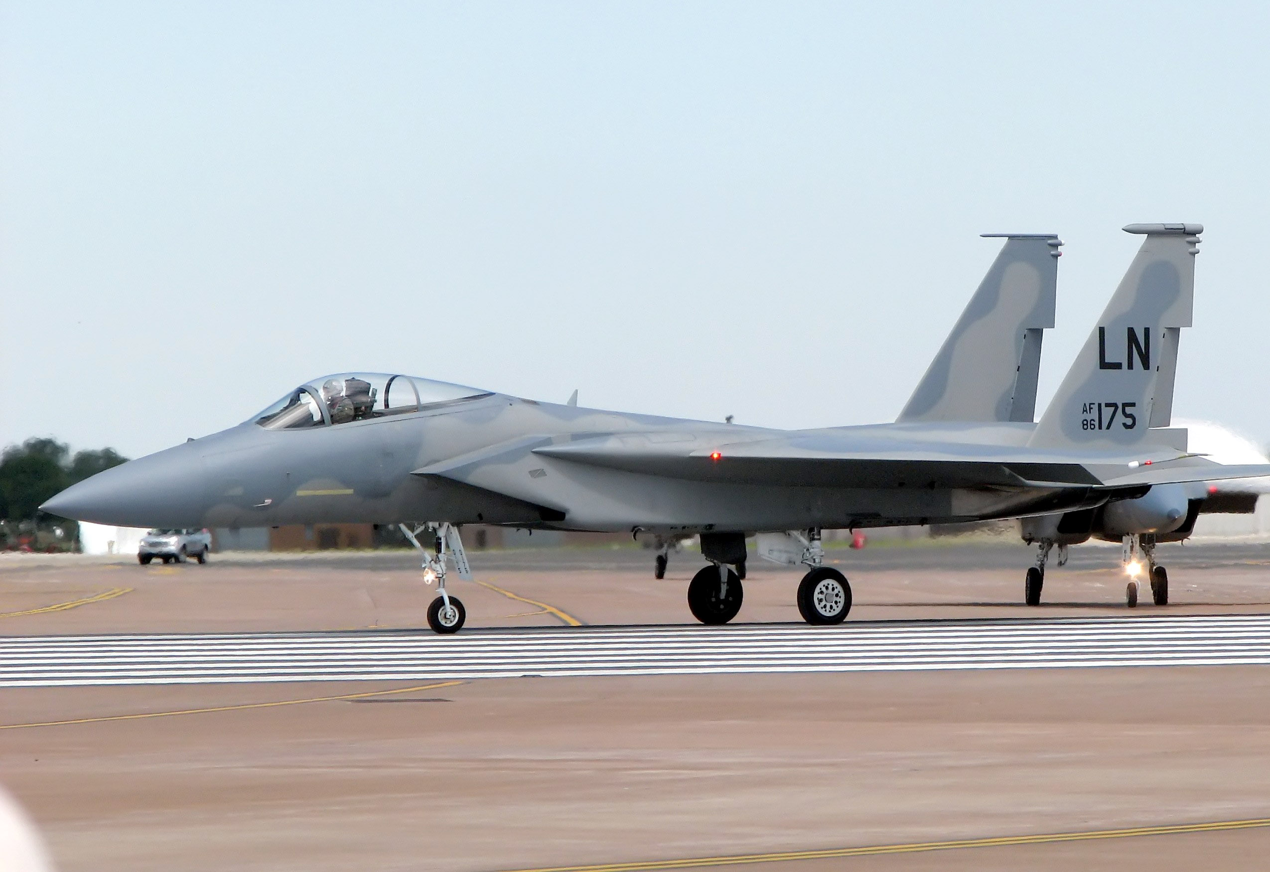 Description: F-15C Eagle (identifier 86-0175/LN), of the United States Air Force, taxis for takeoff at the Royal International Air Tattoo, RAF Fairford, Gloucestershire, England.
