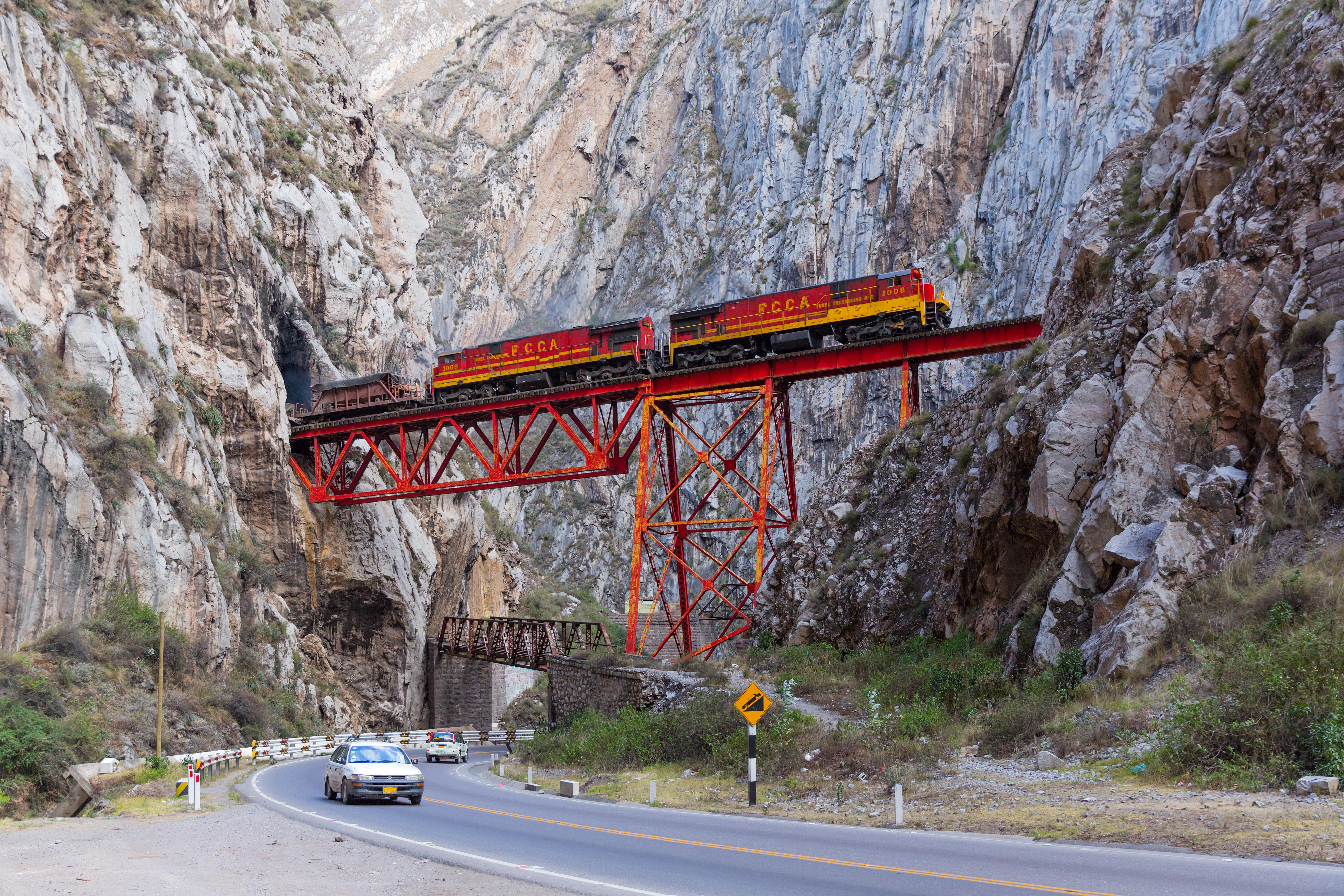 Description: Ferrocarril Central Andino's GE C30-7 1008 and 1009 cross the Infernillo ("little hell") viaduct between San Mateo and Rio Blanco, Peru.