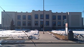 Description: City Hall in Fairbanks, Alaska, located at 800 Cushman Street in its downtown area. Originally constructed in the 1930s as the Fairbanks public schoolhouse, known colloquially for many years as "Old Main."