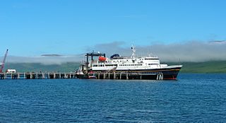 Description: The Alaska State Ferry, Tustamena, at the False Pass city dock.