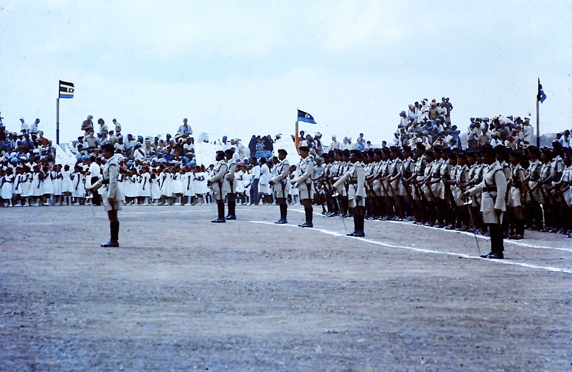 Description: A regiment taking part in a military parade, as part of celebrations linked to the new Federation of South Arabia . The flags are those of the Federation (with yellow stripes) and of the Fadhli Sultanate, where the event took place in 1962 or 1963.