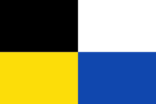 Description: Flag of the Belgian commune of Kluisbergen. The municipal flag of Kluisbergen is quartered black-white-yellow-blue.