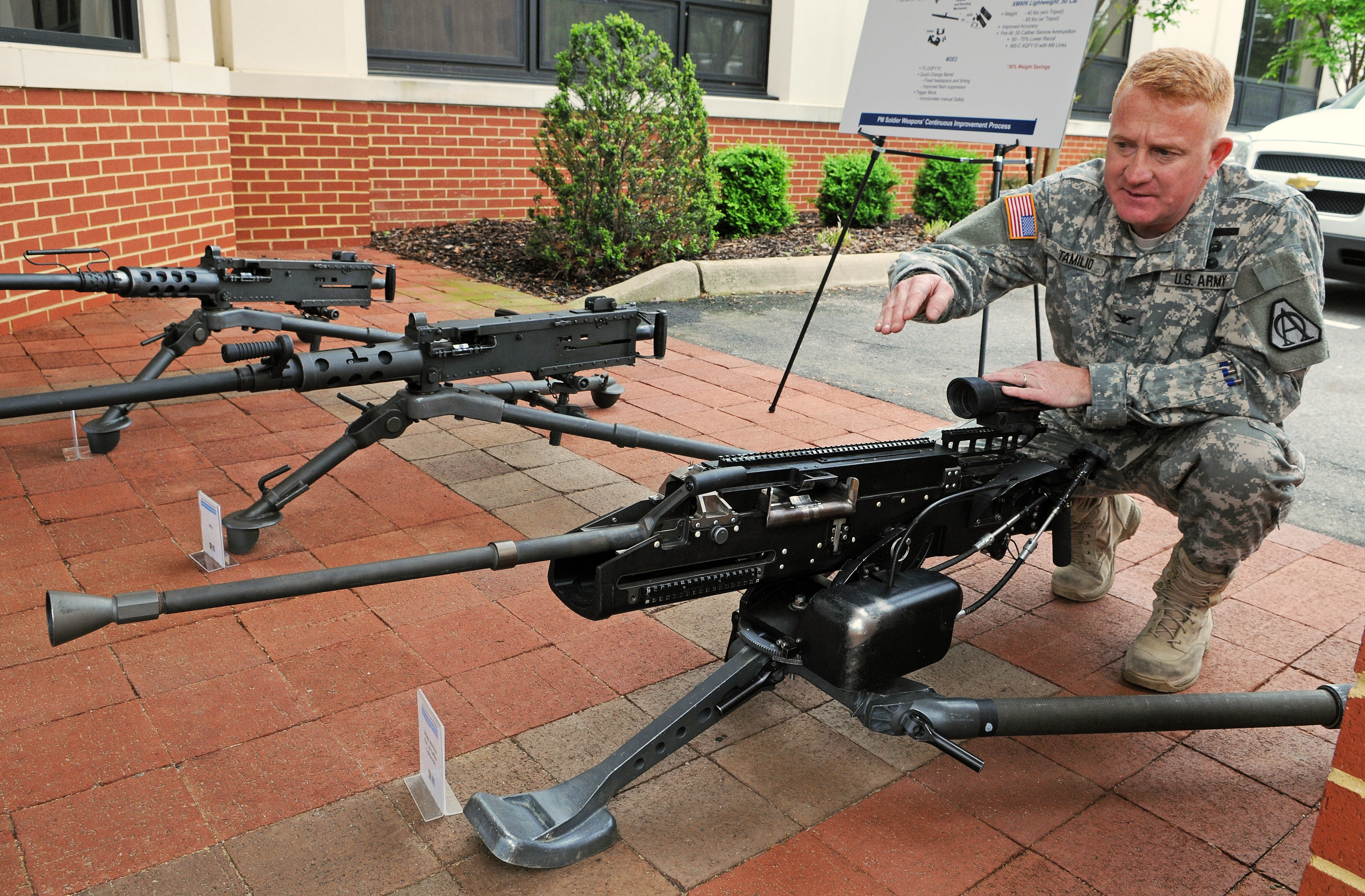 Description: Col. Doug Tamilio, program manager for Soldier weapons and Soldier lethality and weight reduction, point out features of the Lightweight .50-Caliber Machine Gun. The lighter brother to the M-2 .50-caliber machine gun, it weighs half as much and has half as many parts along with 60 percent less recoil. PEO Soldier unveils lighter, more lethal weapons systems See more at Army.mil