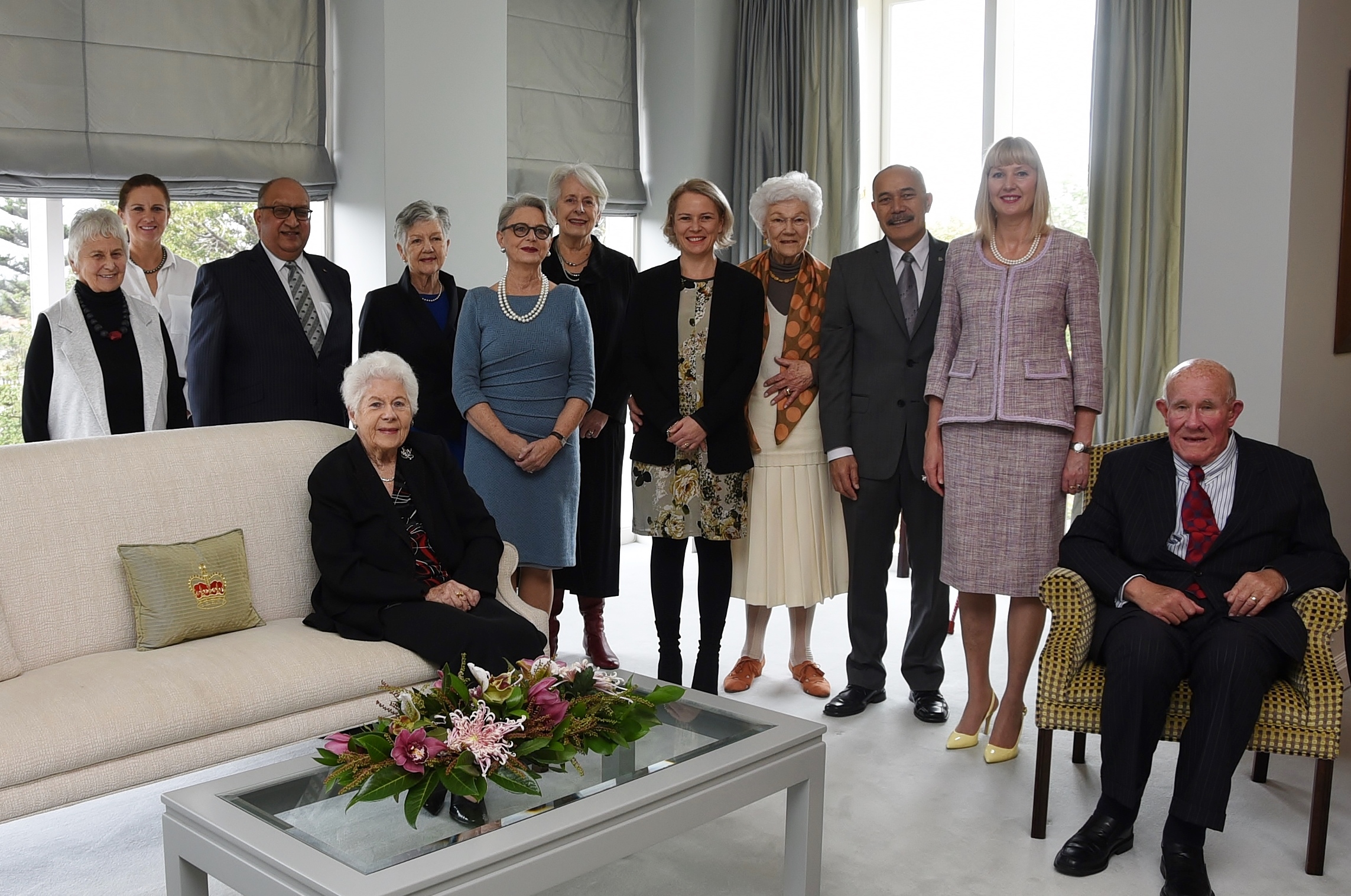 Description: Lunch for former New Zealand governors-general, their spouses and guests, at Government House, Auckland, on 13 July 2016, hosted by Sir Jerry and Lady Mateparae. Left to right - seated Dame Cath Tizard; Peter Cartwright; back row Beverley, Lady Reeves; Bridget Jakicevich (daughter of Sir Paul Reeves); Sir Anand Satyanand; Susan, Lady Satyanand; Anne Culpan (daughter of Catherine Tizard), Dame Silvia Cartwright; Cate Slater; Norma, Lady Beattie; Sir Jerry Mateparae; Janine, Lady Mateparae