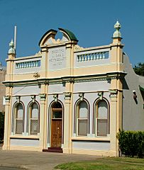 Description: Former Wickham council chambers. Single storey cement rendered and painted building. Florid motifs are used as key stones over round arched windows. Plastered columns with decorative cupolas lead up to a dentilated cornice. A decorative parapet with silhouetted skyline hide roof treatment behind. Emphasis to the main door is by broken pediment and classical scroll motifs on either side.