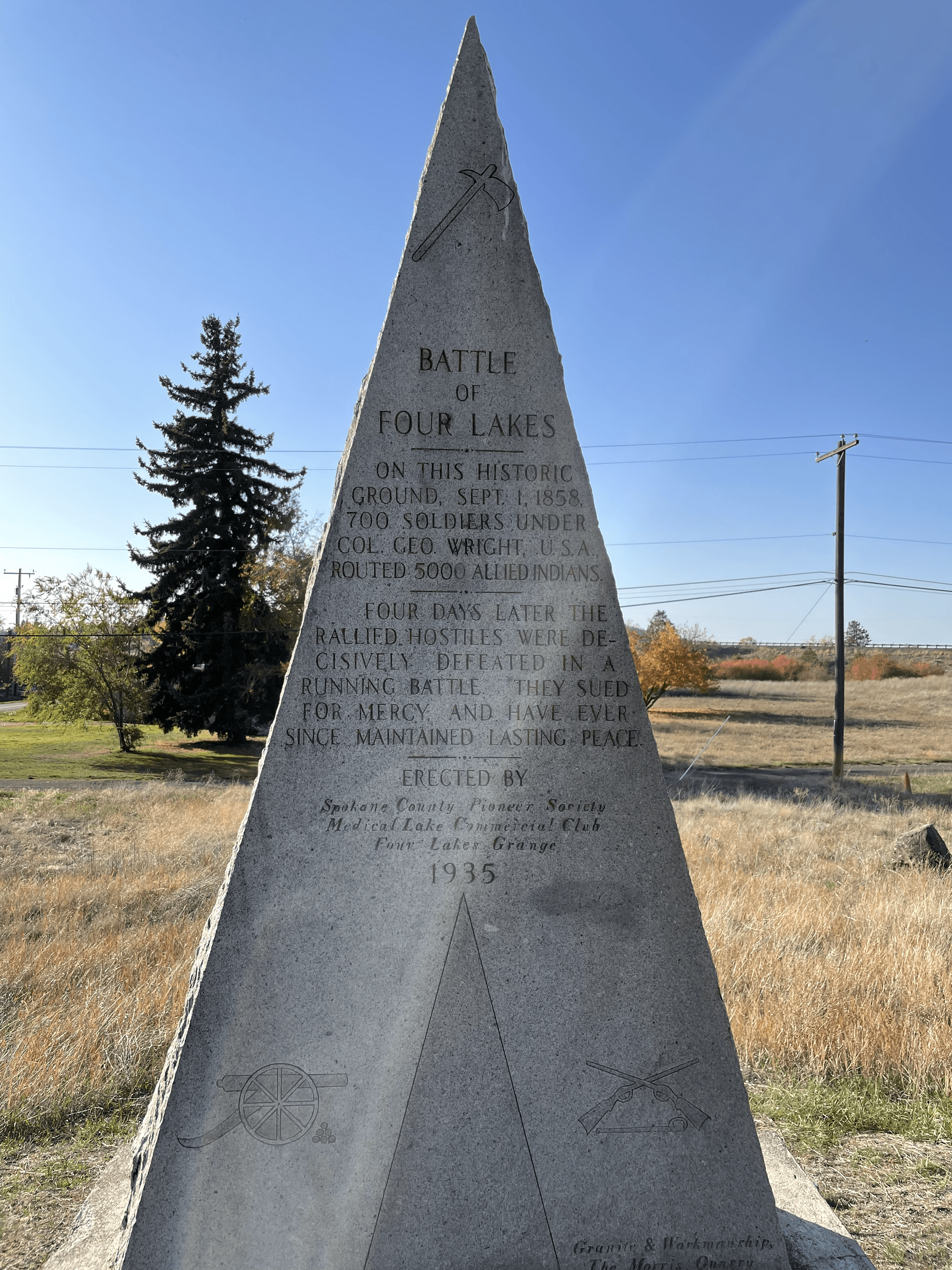 Description: Battle of Four Lakes monument in Four Lakes, Washington in October 2021.