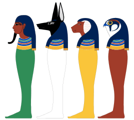 Description: The four sons of Horus: (from left) Imsety, Duamutef, Hapy, and Qebehsenuef. Part of the ancient Egyptian religion, the four sons of Horus are protectors for four internal organs of the deceased.