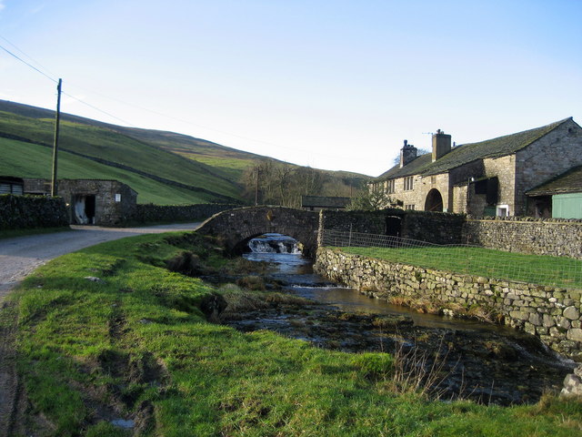 Description: Foxup Beck The beck flowing through the hamlet of the same name, just before it joins Cosh Beck to become the River Skirfare