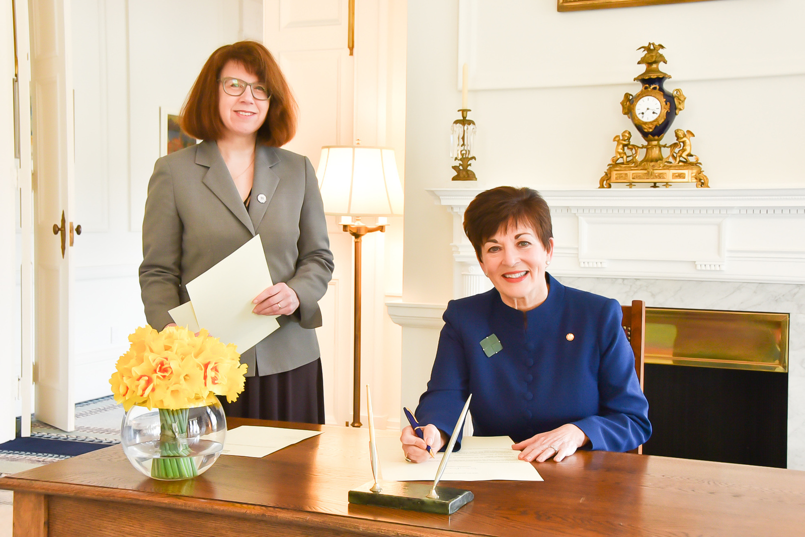 Description: Governor-General Dame Patsy Ready signs the writ for the 2020 New Zealand general election before chief electoral officer Alicia Wright.