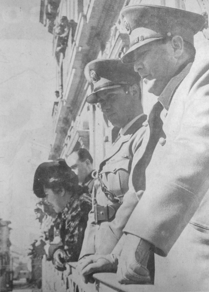 Description: Bolivian President Germán Busch standing on a balcony. To his left is his wife Matilde Carmon and to his right is Commander-in-chief of the Army Carlos Quintanilla.