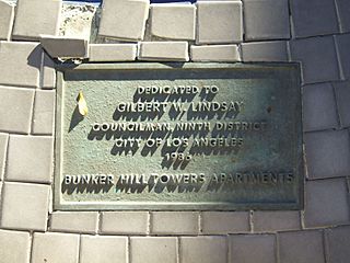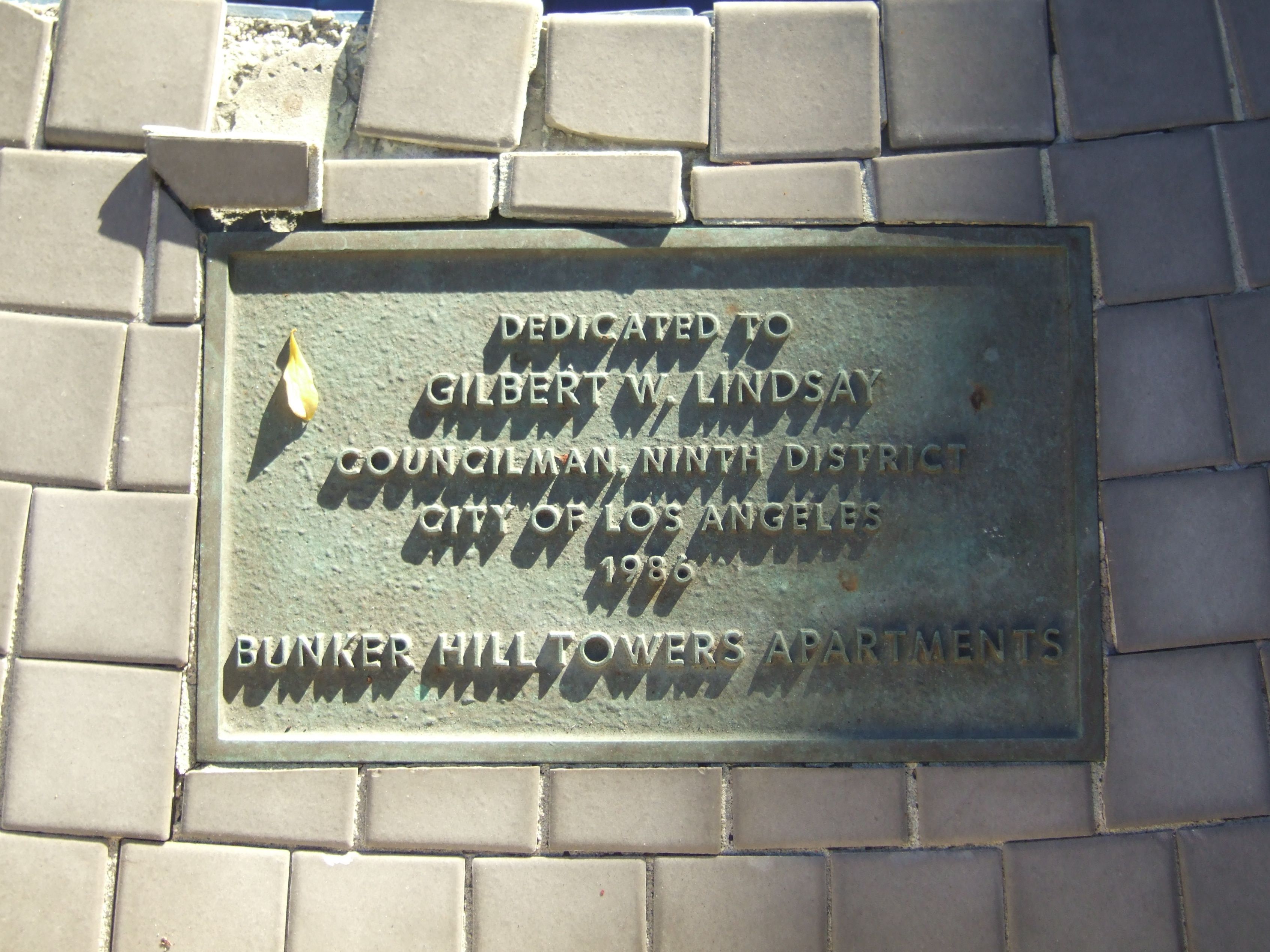 Description: I took this photo myself at Bunker Hill Towers in Los Angeles. The plaque is attached to a fountain honoring City Council Member Gilbert Lindsay.