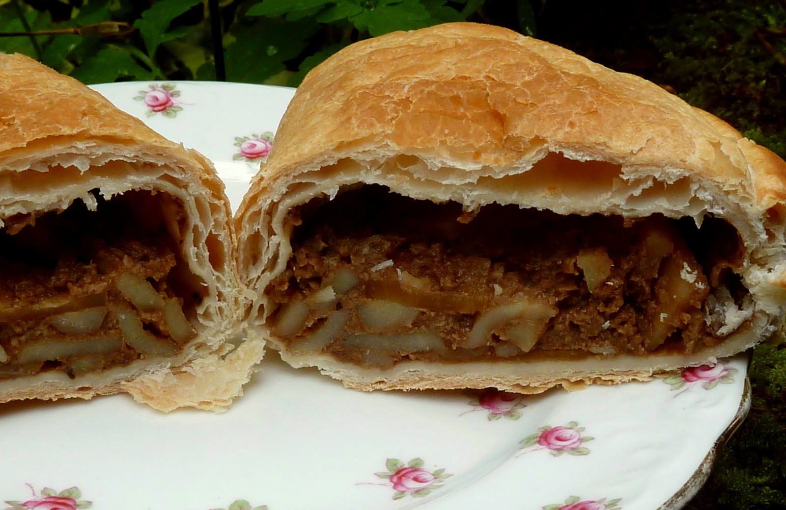 Description: Ginsters vegan quorn pasty. The plate is the Rosedale, or Hathaway Rose, pattern by John Aynsley, dated 1905-1925.