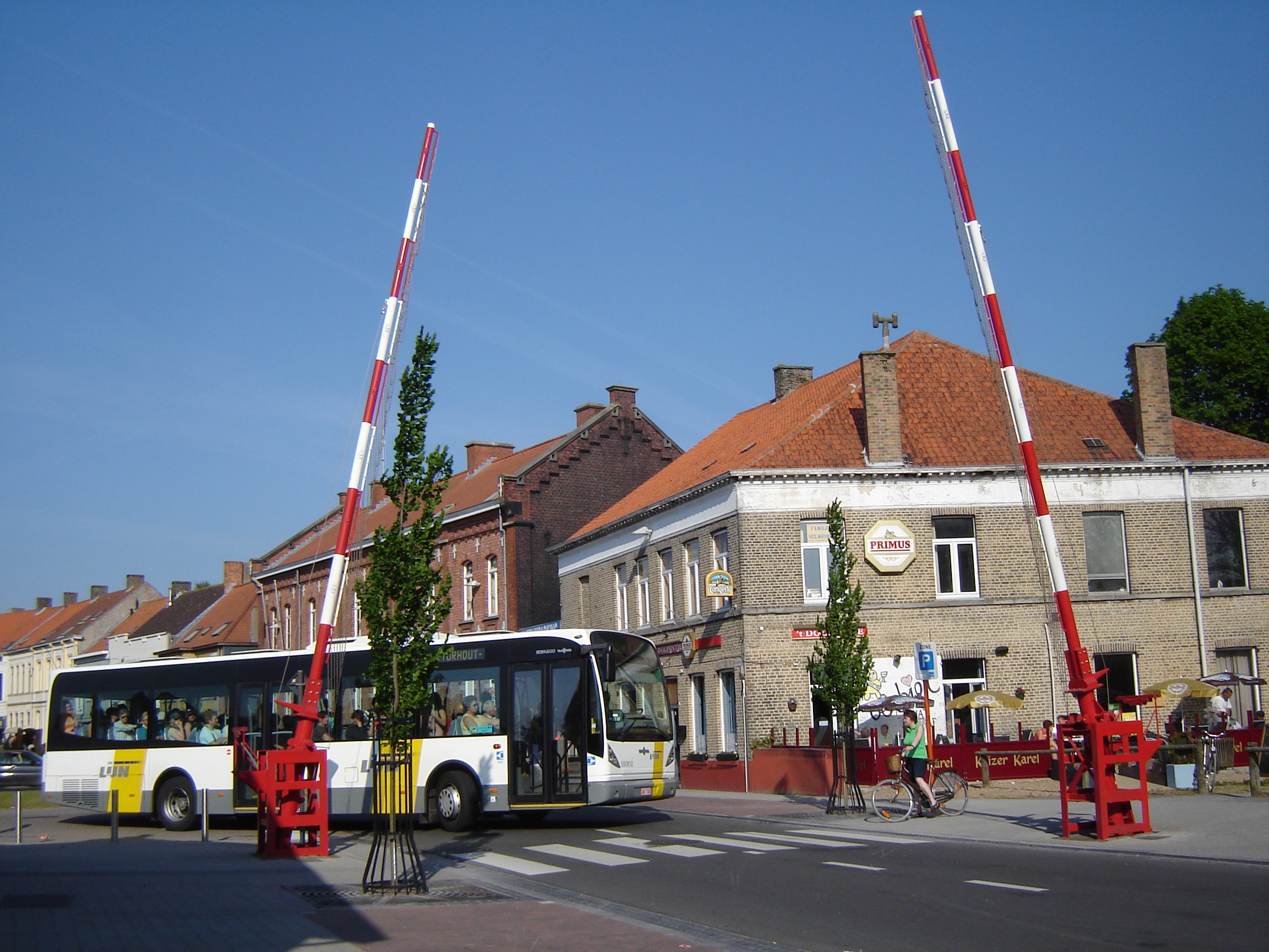 Description: Crossing of cycleway Groene 62 with the street Nieuwpoortse Steenweg. The cycleway Groene 62 is a former railway, hence the old barriers. Gistel, West Flanders, Belgium