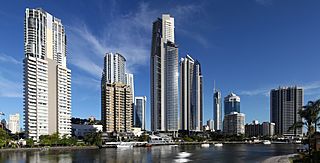 Description: Gold Coast skyline view from Nerang river, Chevron Island.