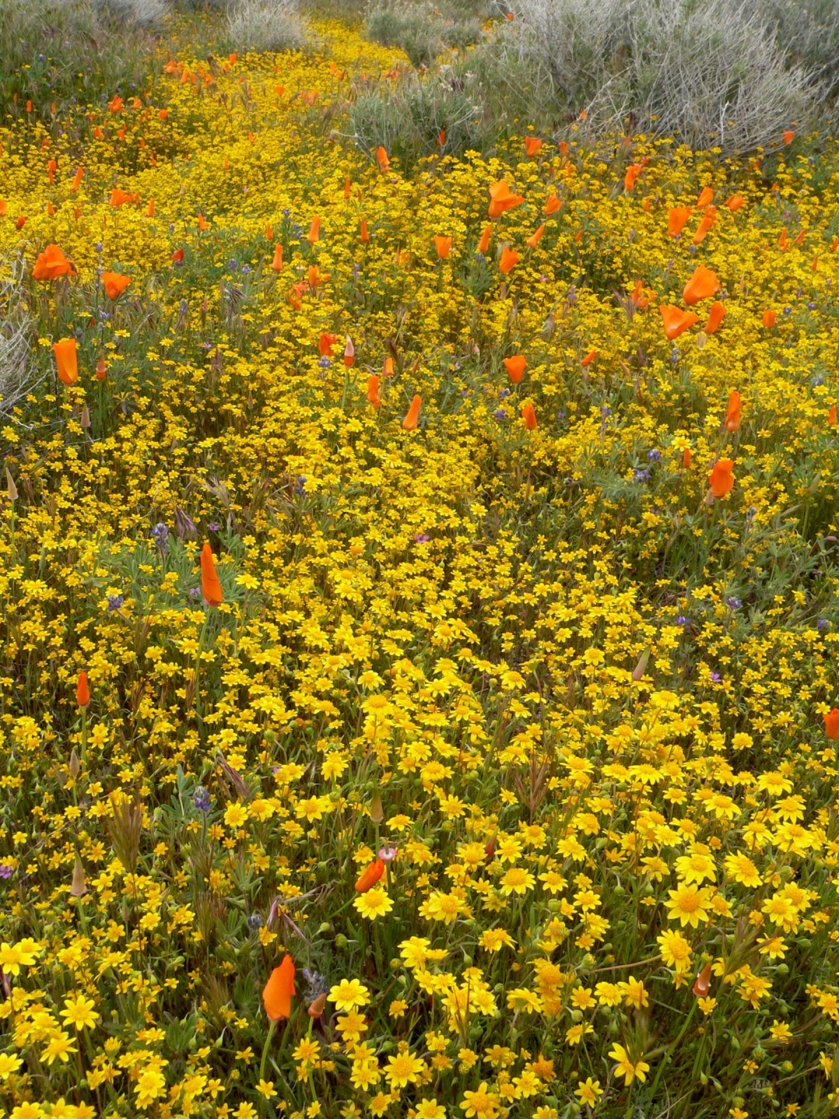 Description: Field of goldfields (Lasthenia californica) and some scattered California poppies (Eschscholzia californica), California Poppy Preserve, Mar 17, 2005.