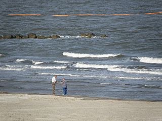 Description: Beach at Grand Isle, Louisiana. Two men collecting samples of oil from Deepwater Horizon oil spill. Oil containment boom off shore.