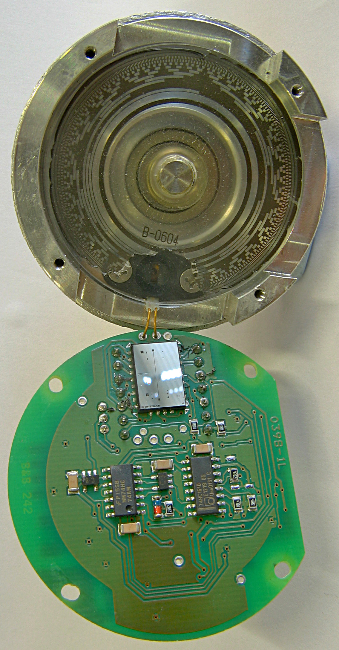 Description: A Gray code absolute rotary encoder with 13 tracks. At the top can be seen the housing, interrupter disk, and light source; at the bottom can be seen the sensing element (reflective, marked 'OPTOLAB') and support components. This encoder was removed from a machine after water ingress caused the gray code tracks to lift off.