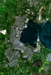 Description: w:Geelong, Victoria and suburbs, including Lara in the north, Grovedale in the south-west and Moolap in the south-east. The western end of Corio Bay, including Point Henry, is visible.