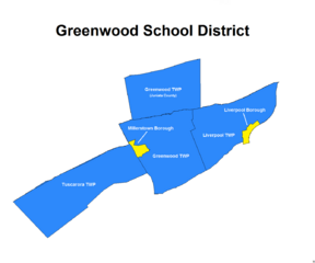 Description: A map of the Greenwood School District showing the boundaries of the six municipalities the district encompasses.