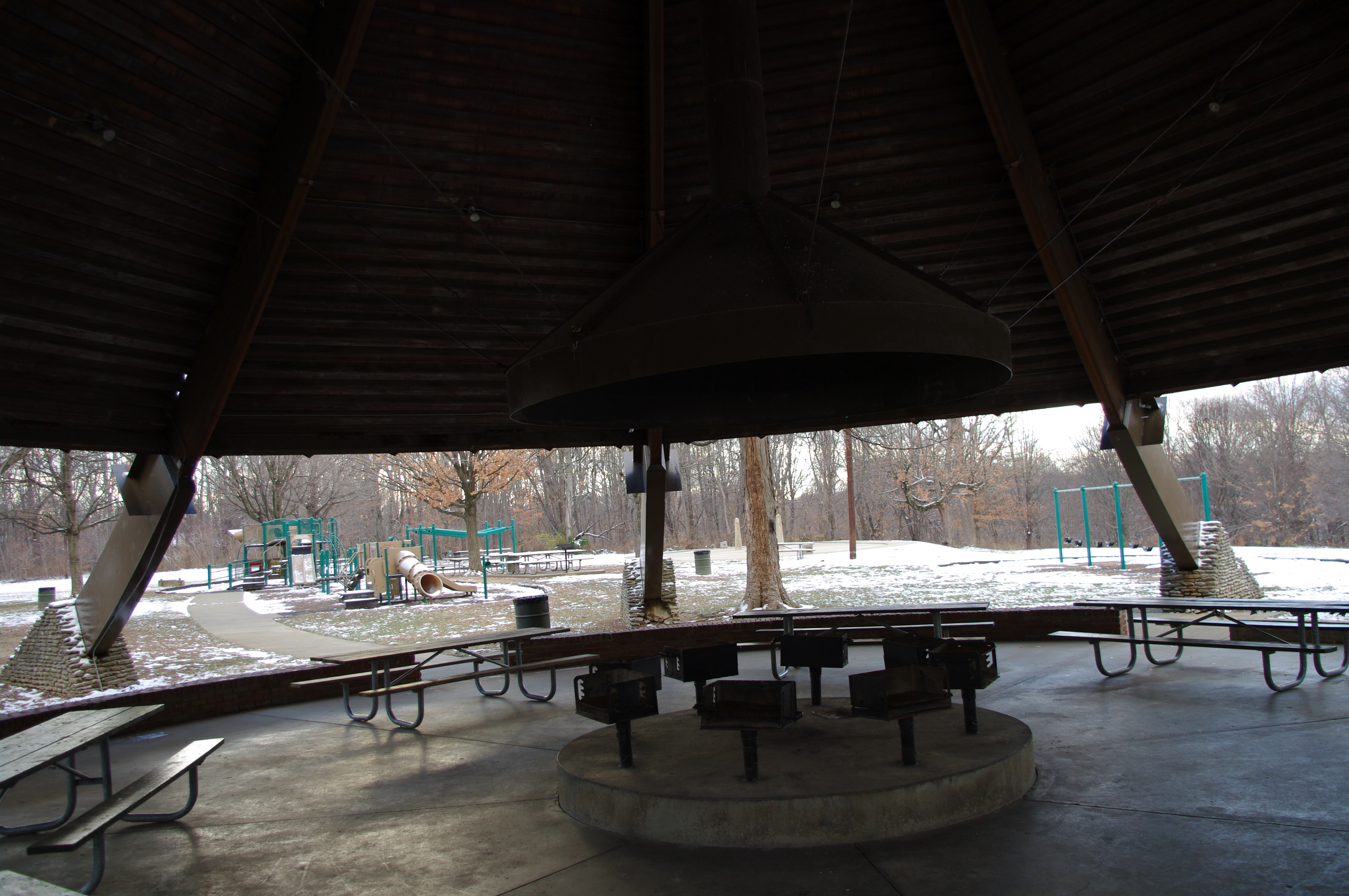 Description: Interior and grills of Hogan Fountain Pavilion, in Cherokee Park, Louisville, Kentucky.