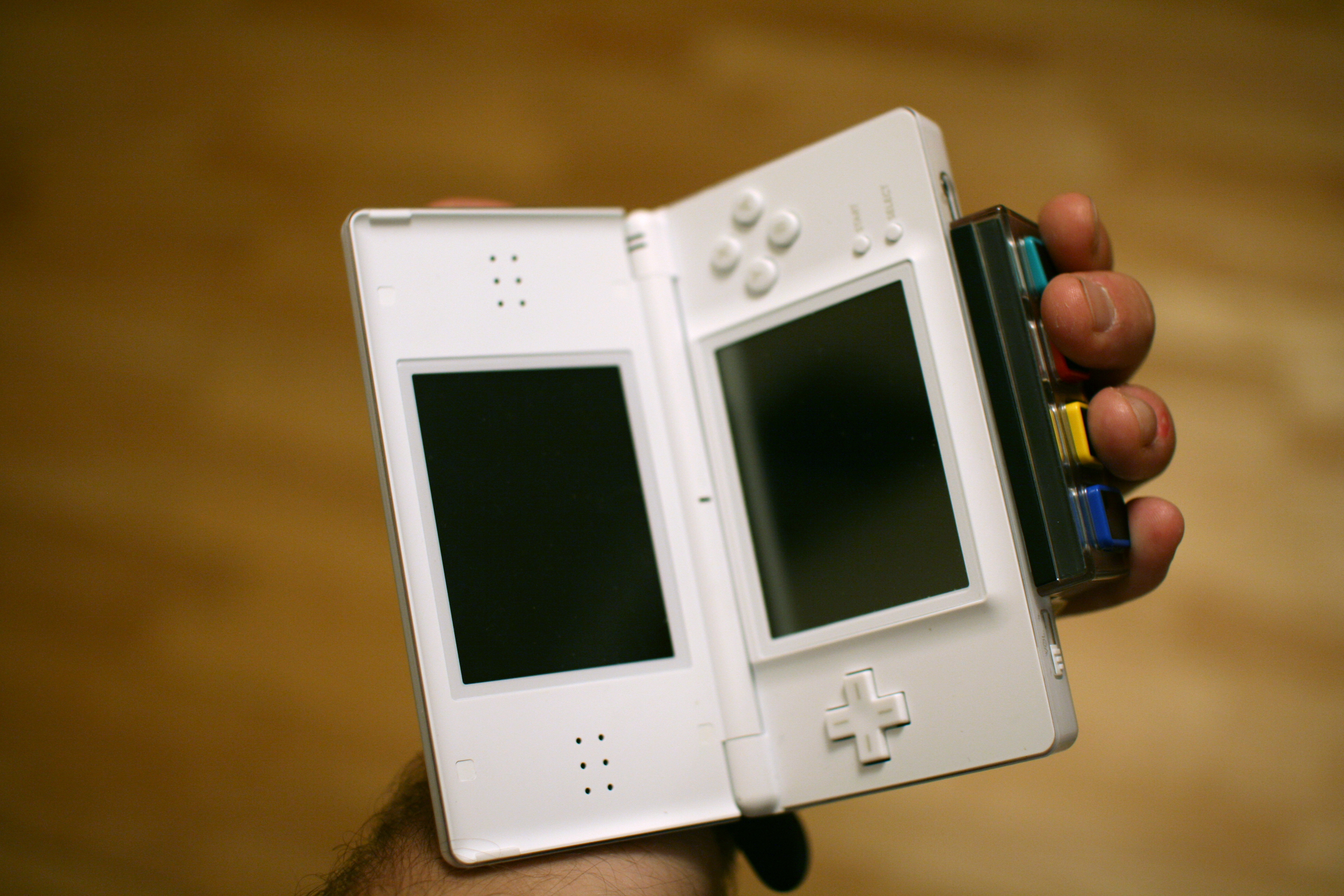 Description: The "guitar grip" interface used for DS Guitar Hero video games, showing 4 colored buttons on a device attached to the DS.