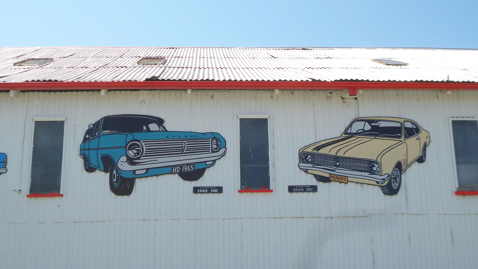 Description: "Holden Wall of Fame", Bailey's Garage, Gunning New South Wales. Paintings depict 1965 HD and 1968 HK Monaro models.
