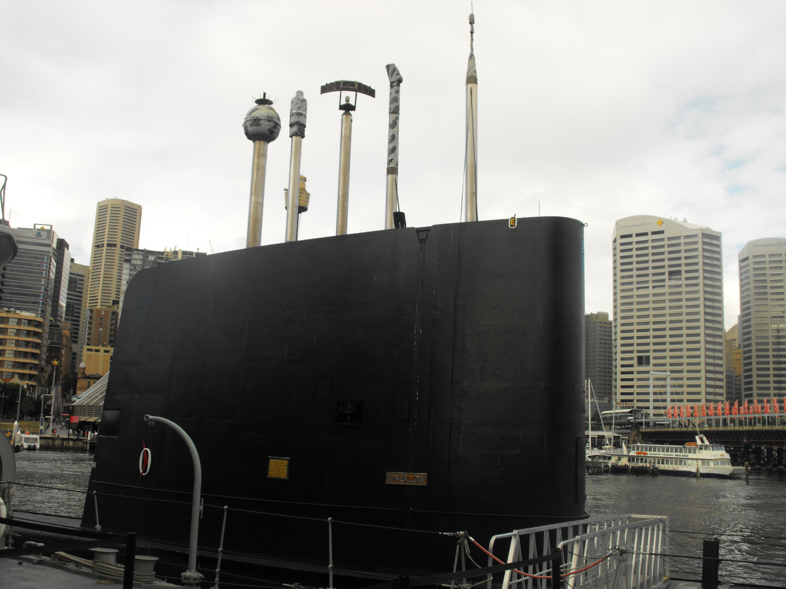 Description: The fin and equipment masts of the Oberon class submarine HMAS Onslow From right to left, the masts are: attack periscope, search periscope, radar mast, electronic support measures (electronic warfare) mast, and the snort induction (diesel generator air intake) mast. Not seen are the wireless telegraphy mast, and the snort exhaust (diesel generator exhaust) mast.[1]