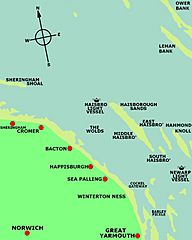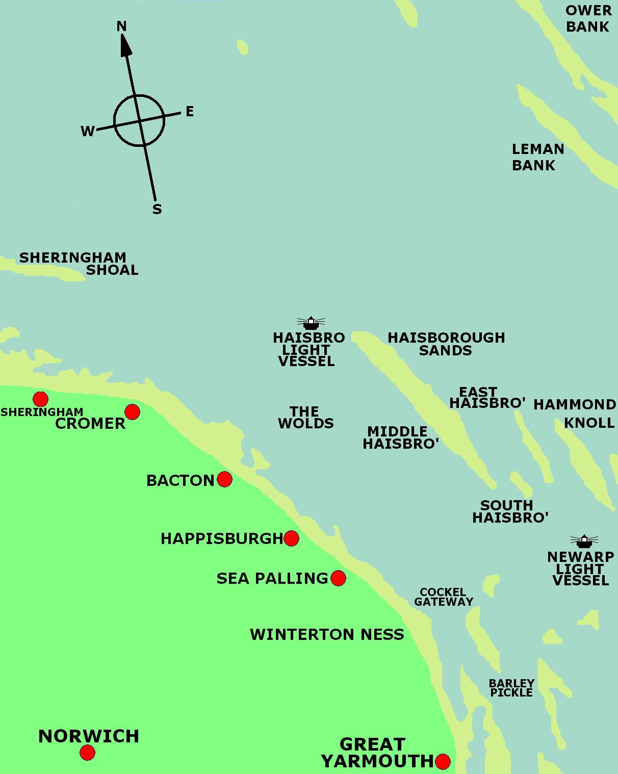 Description: A map of the area of the North Norfolk coast showing sand banks in the area.