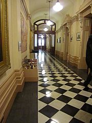 Description: Black and white floor tiles and pendant lights in a hallway, Parliament House, Adelaide, South Australia, Australia.