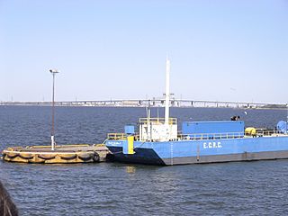 Description: The waters of Burlington Bay, also known as Hamilton Harbour, looking east toward the span of the Burlington Bay James N. Allan Skyway. Photographed from the port deck of HMCS Halifax in Hamilton, Ontario.