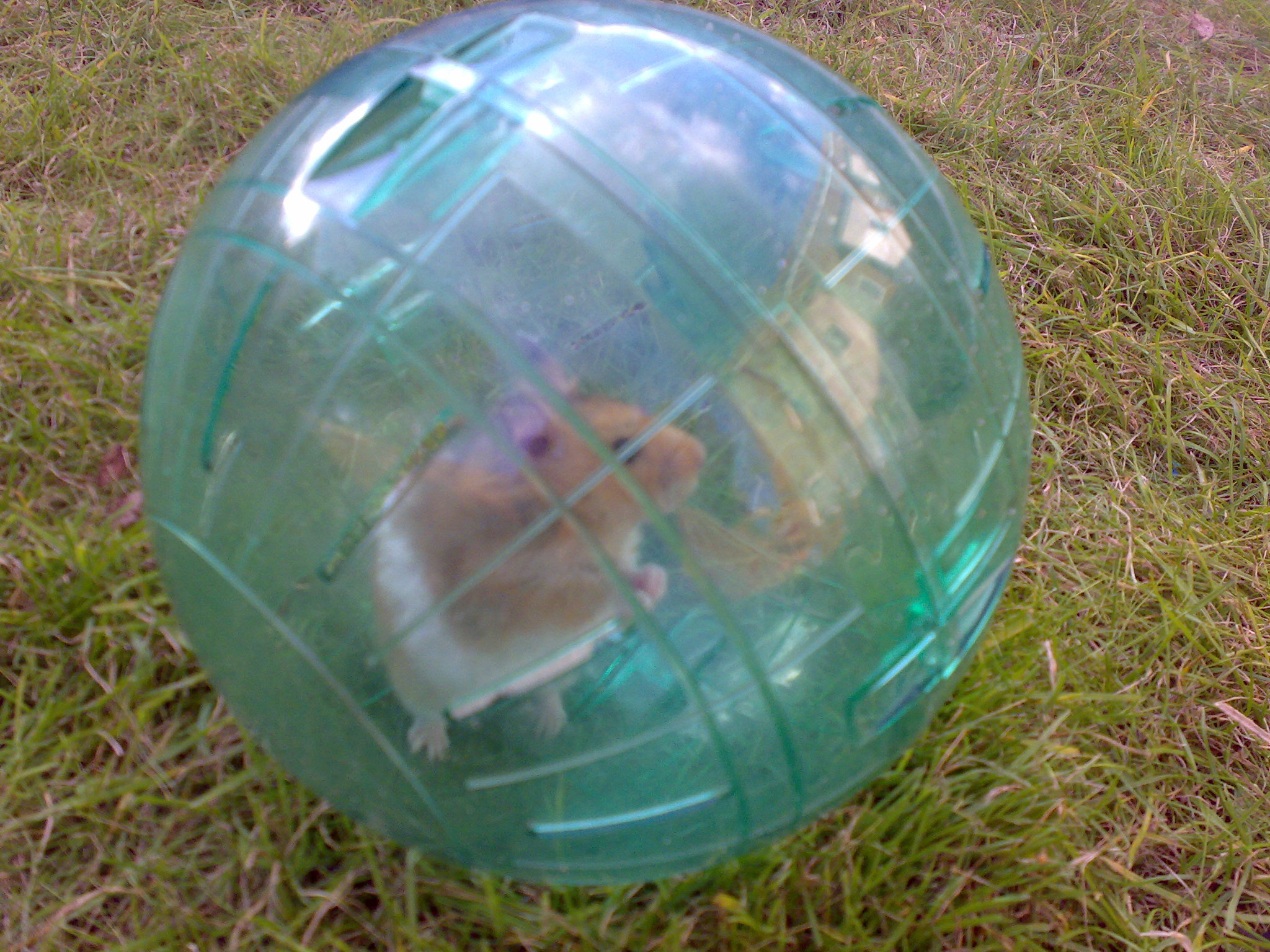 Description: A hamster outside in a ball