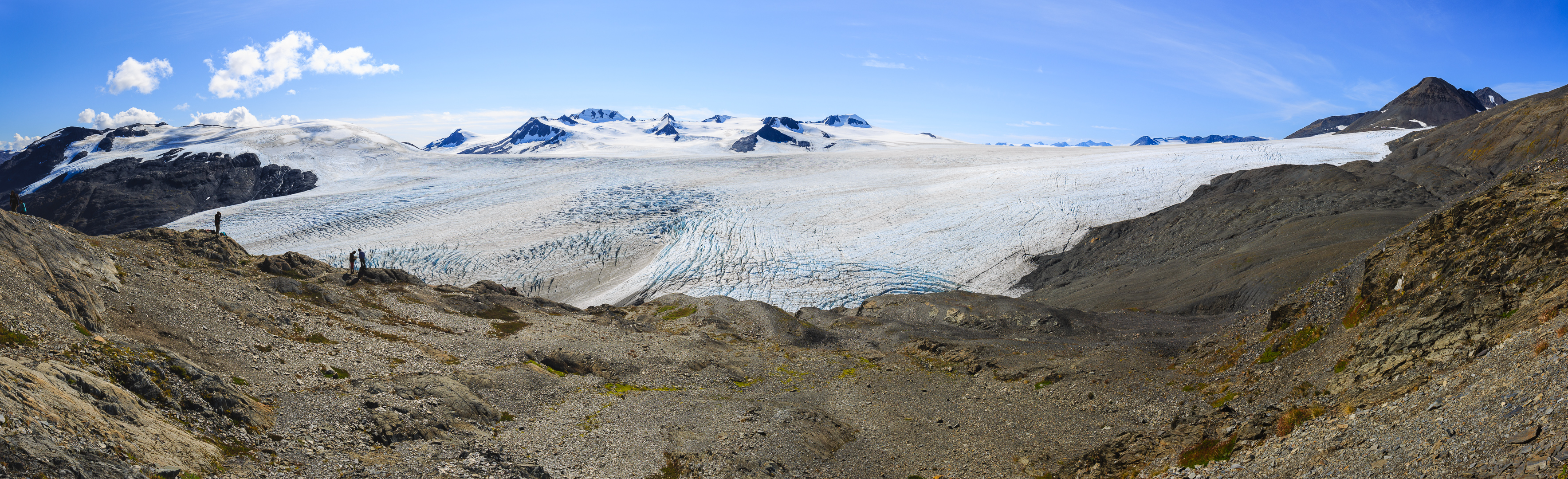 Description: Harding Icefield and the very beginning of Exit Glacier, which is flowing in the valley to the left. Panorama made from four photos.