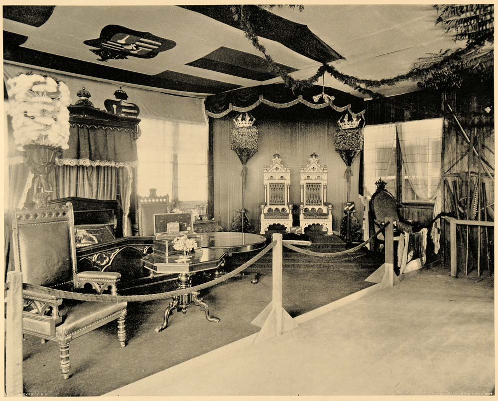 Description: The Thrones of Hawaii, royal furnishings, the royal feather cloak, kāhili and royal standards, along with other items being displayed in the Hawaiian Village at the California Midwinter International Exposition of 1894, in San Francisco.