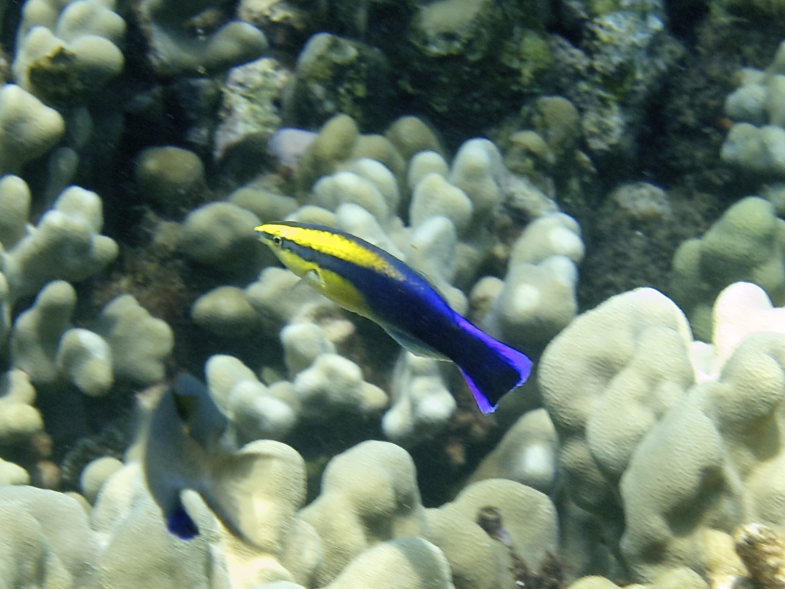 Description: Hawaiian cleaner wrasse seen off Old Airport Beach, Maui, HI. Depth 10ft.