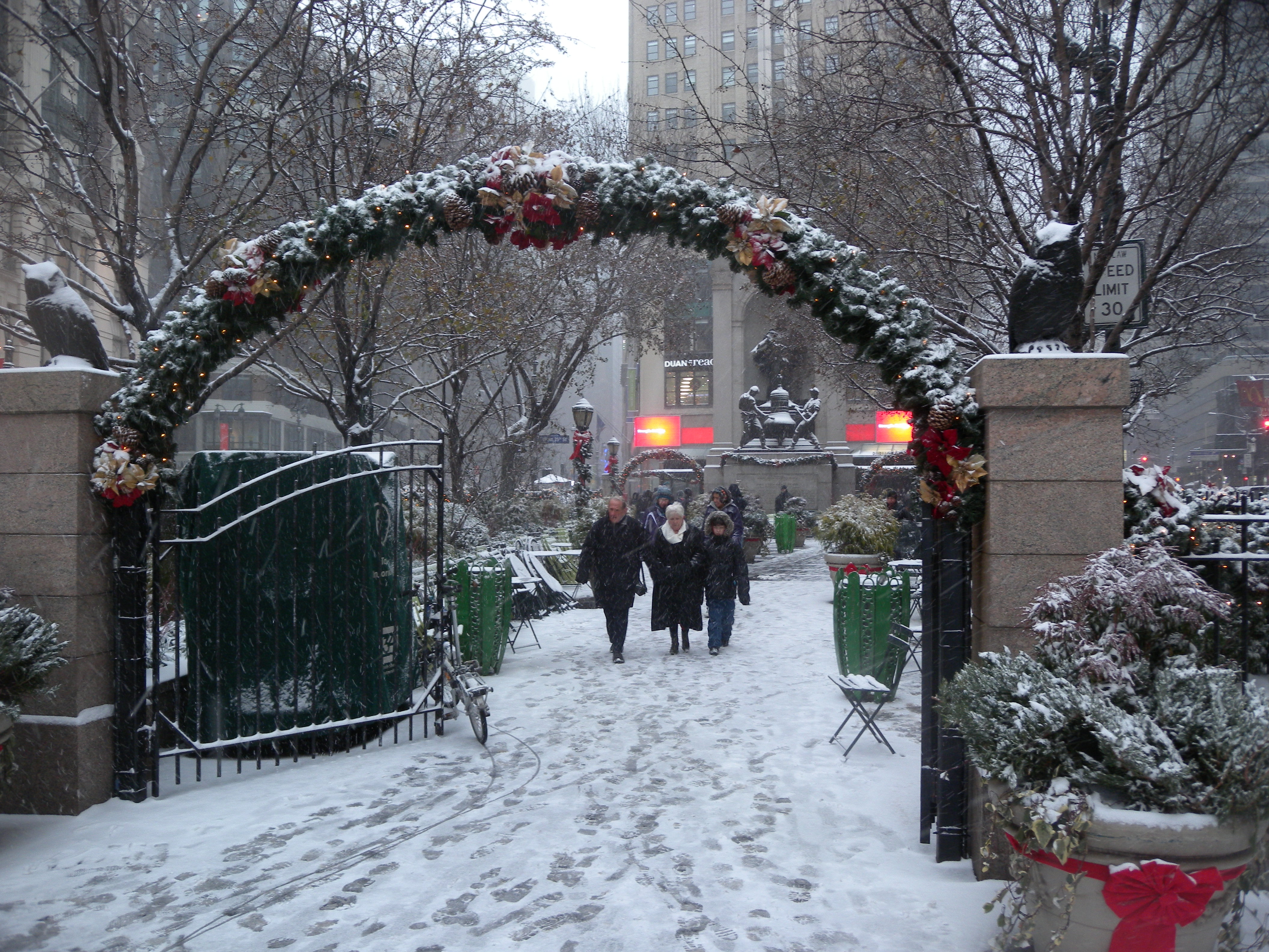 Description: Looking north into Herald Square after a couple hours snowing. Bicycle is photographer's.